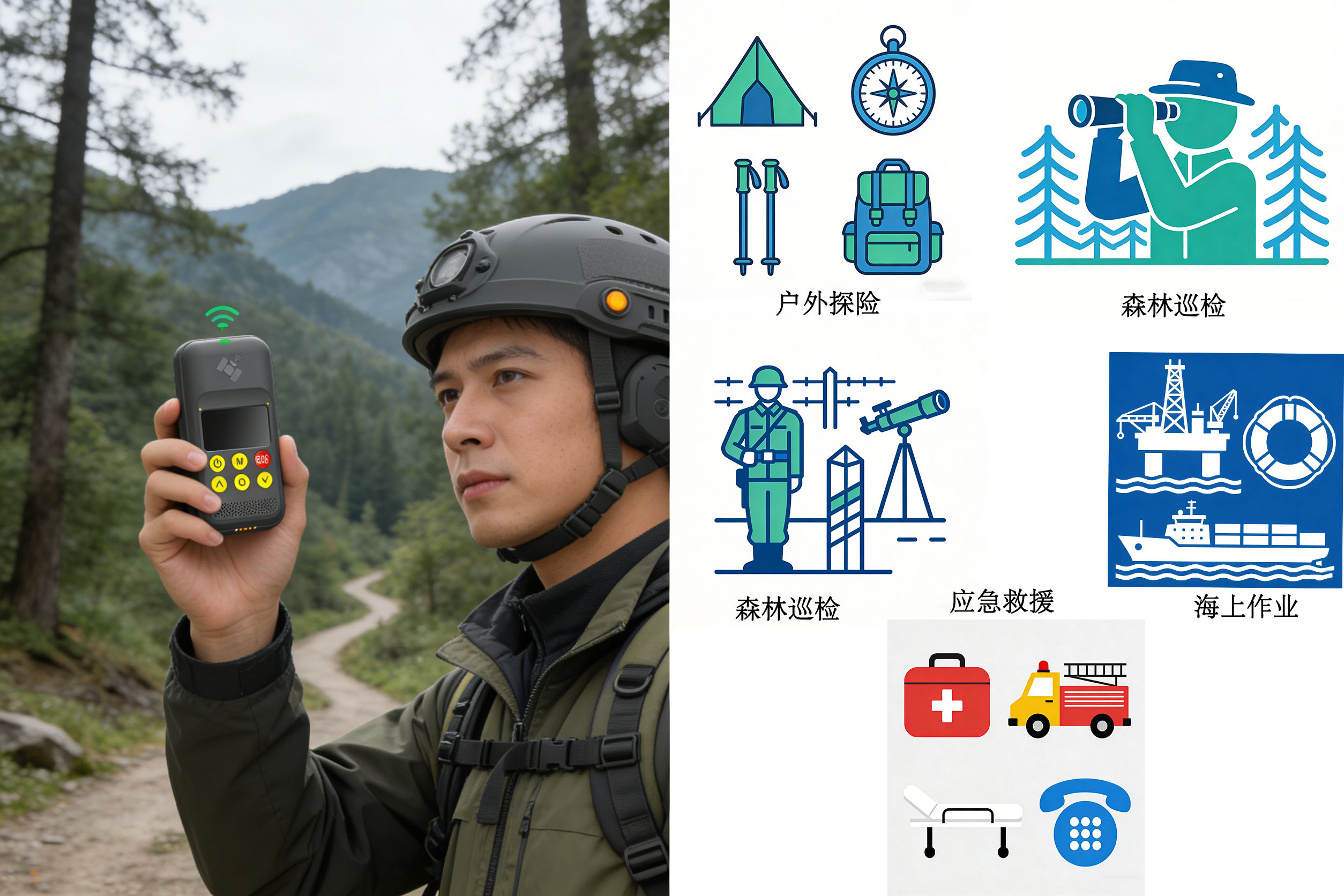 本产品采用高集成化设计,内置收发天线与RDSS模块,支持IP67防护等级,具备强劲的续航能力,在极限模式下可持续工作长达120小时。用户可通过蓝牙连接手机APP,实现短报文收发、位置查看、历史记录管理等功能,亦可直接通过设备按键、语音指令进行快速操作,是户外作业、应急救援、巡检巡逻、海上作业等场景下的可靠通信与安全保障工具。